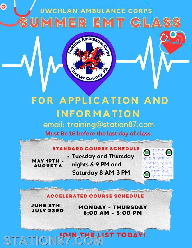 | The Uwchlan Ambulance Corps Summer EMT class is now open for registration. For complete details, please review the brochure provided below. |